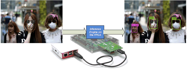 Facemask detection using deep learning inference that is run on FPGA.